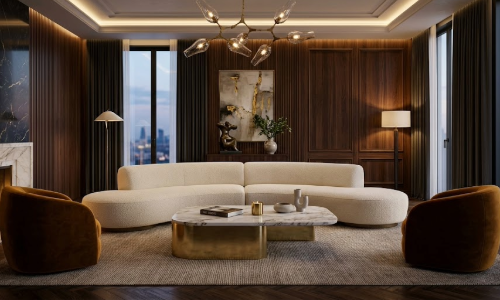 A refined interplay of warmth and sophistication, designed to create spaces that feel both inviting and distinguished. Rich textures, layered lighting, and carefully composed forms bring depth and character without overwhelming the composition.